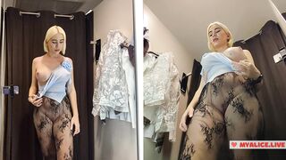 Blonde with big Tits Try on haul Clothes in Mall. Milf in Fitting Room