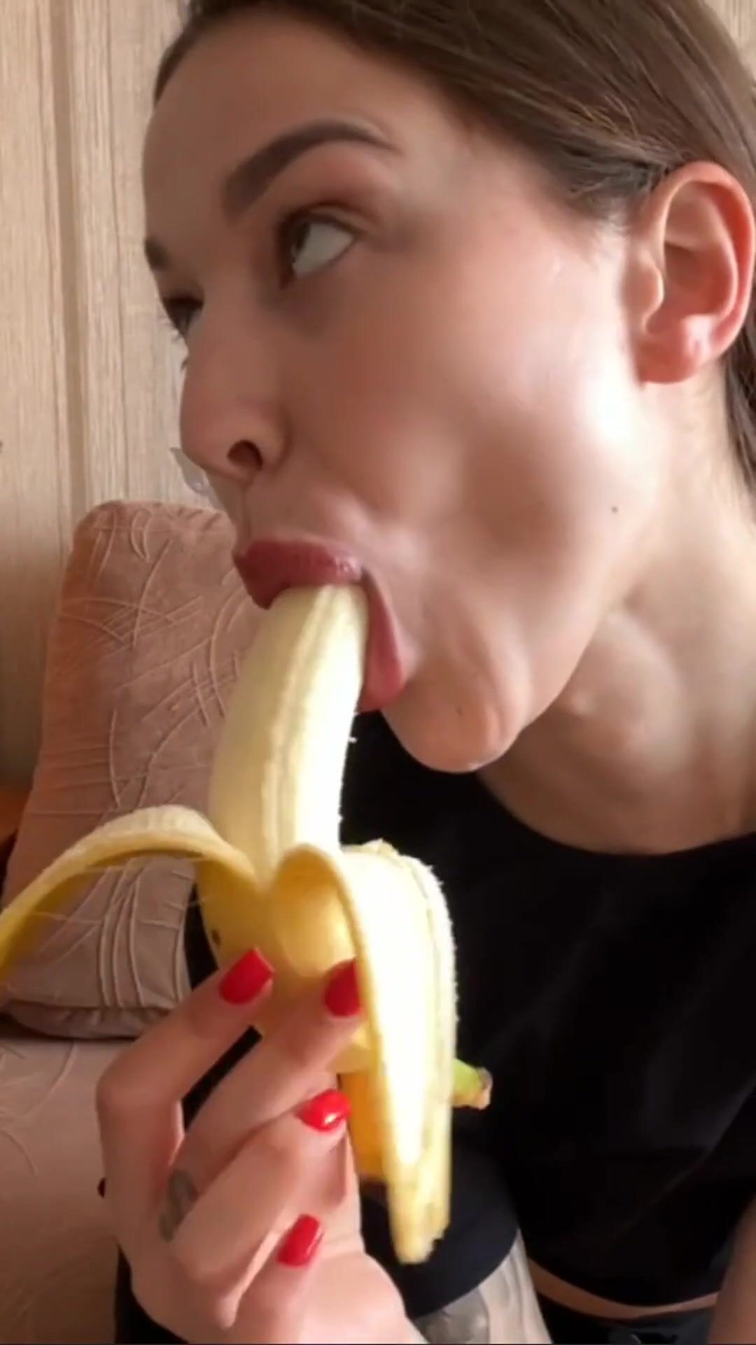 cute student licks her own banana in front of the camera.