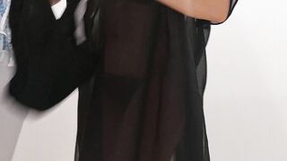 Amateur woman trying on clothes in the changing room. Hairy pussy, big tits, big nipples.
